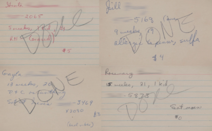 "It would change voices sometimes. Then someone would pick up all the names from the tape and call the people back and collect a little bit of information on the woman- her name, address, age, phone number, how many weeks pregnant she was, if she had any medical problems, history of twins, history of bleeding- and we'd tell her how much it might cost."