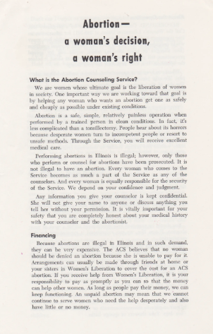 Once clientele grew past Booth’s abilities, she met and invited other activists to join. As a female collective, they devised a network focused on reducing panic by meeting and counseling women while providing affordable abortions through price negotiations with Howard.